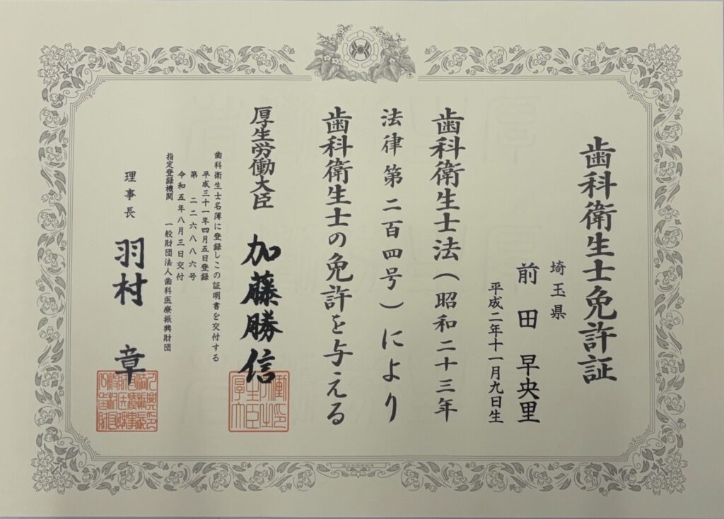 歯科衛生士学校で 優等賞 を受賞しました。(※賞状の苗字は旧姓)